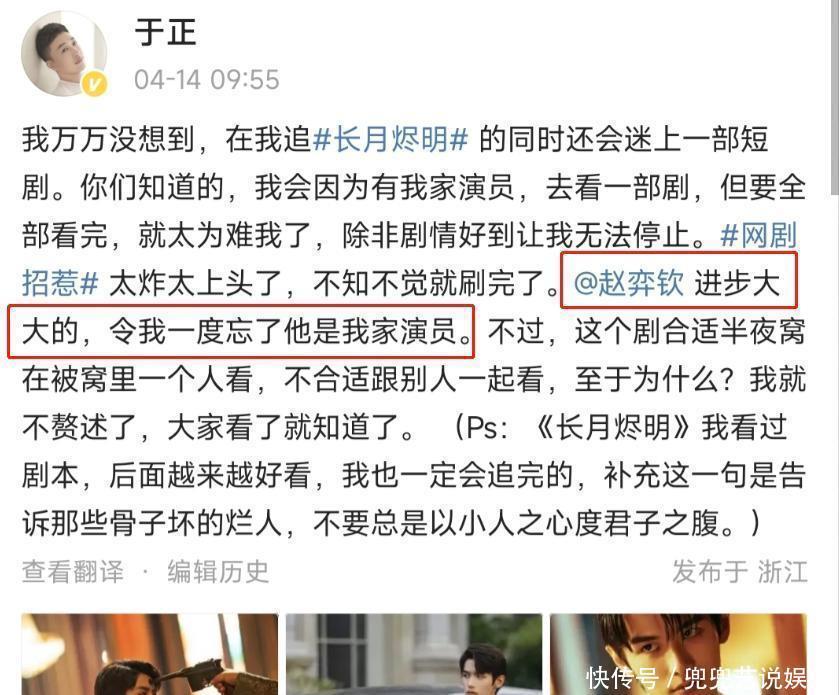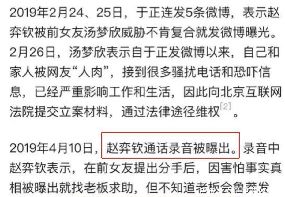 不要怀疑你的眼睛,这则大新闻说的是真的,是男明星和一位男性大佬之间的事件!前女友警告赵弈钦:“如果你敢提出分手,我就把你的私事全部曝光。”最近,赵弈钦主演的网剧《招惹》刚结束,导演于正在微博上为他旗下的男演员赵弈钦加油。