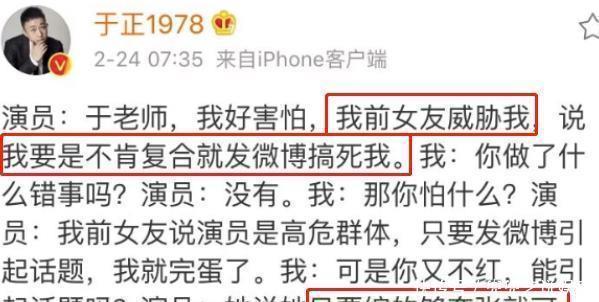 这件事要从导演于正这里讲起!2019年2月24日,于正在微博上分享了与自己旗下男演员的聊天记录。从中可以看出,于正收到了一名艺人的求助信息。赵弈钦把心里的担忧告诉于正:“我真的感到很害怕,不知道该怎么做才好。”