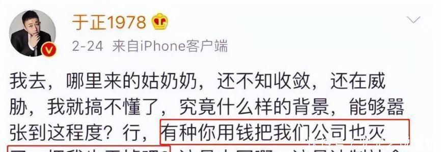于正看到这种情况,实在忍不住了,再加上涉事的是自己旗下的演员,作为老板,自然要站出来,帮着解决问题,保护赵弈钦。于正开玩笑地说,我倒是要看看你到底有什么本事,竟然敢不把国家的法律放在眼里。如果你有实力、有财力,而且敢拼敢闯,那就来挑战我们吧,试着把我们公司搞垮。别再欺负那些小演员了。