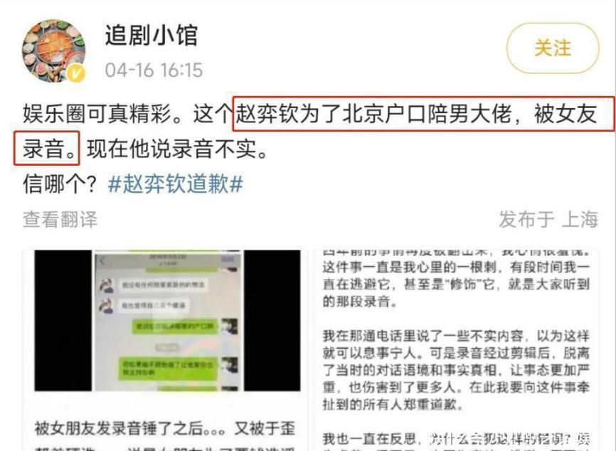 4月16日,赵弈钦发布了一则道歉声明,提到四年前的事情,这难道不是间接承认了那些问题吗?这样一来,于正老板的解释还能往哪儿藏呢?总结一下对于赵弈钦发布的道歉消息,很多网友调侃道:“这明显是陪睡了,简直就是翻车现场。”如果不想让人知道的话,除了自己不干,就没有别的办法了。赵弈钦没想到,那些年他干的一些荒唐事,等到成名之后竟然又被别人翻了出来。围观的人也没料到,娱乐圈居然这么复杂。虽然之前也见过不少风波,但大多还是关于男女间的那些事。赵弈钦和男大佬同睡的新闻真是挺让人震惊的,这事儿在娱乐圈里可是头一遭!